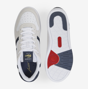 Sneaker lifestyle basse au look rétro inspiré des tennis des années 80 avec cuir blanc et empiècements suède colorés, logo crocodile emblématique et semelle en caoutchouc confortable pour un style casual chic