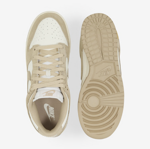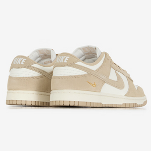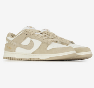 Sneaker basse iconique avec upper mix cuir/daim beige et blanc, détails dorés uniques et semelle caoutchouc pour un look street intemporel alliant confort et style rétro.